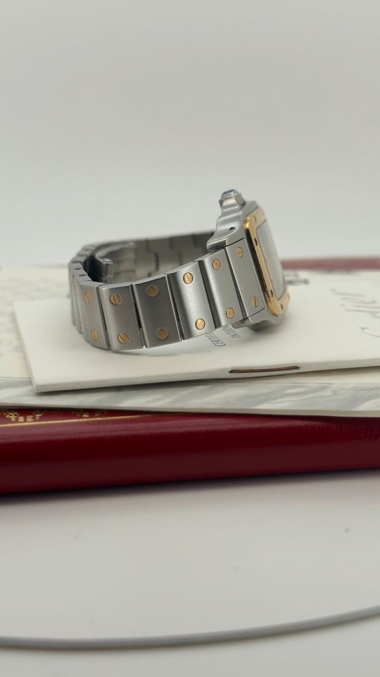 Diese ikonische Santos wurde im Jahr 2000 beim offiziellen Cartier-Konzessionär Juwelier Mauler, Essen erworben und kommt im Full Set inklusive Originalbox, internationaler Garantiekarte und originaler Erstkaufrechnung.