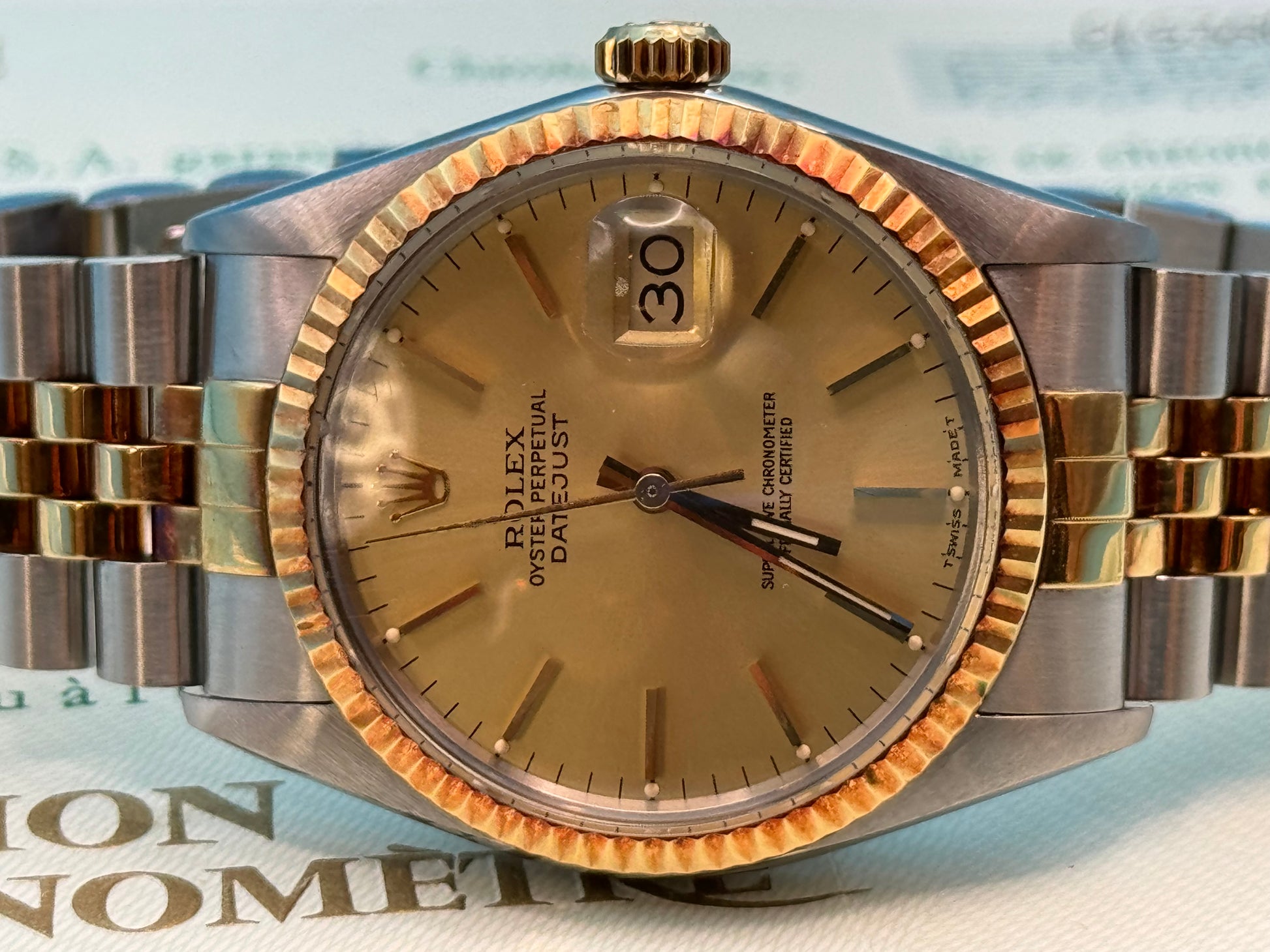 • Zifferblatt: Champagnerfarben mit goldenen Indizes und Datum bei 3 Uhr